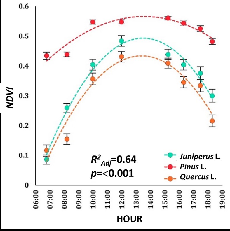 The NDVI trend with the generated model produced results consistent with those derived from the validation since the parabolic trend is similar for all genera, with a maximum around 13:00 h. This indicates that our model has good predictive capabilities, although the causes of the marginal differences (e. g. canopy structure, individual physiological characteristics, etc.) remain to be determined. For example, some species have deciduous leaves throughout the seasons of the year. Also, our sensor has limitations as poor penetrating capacity of sunlight in overlapped canopies.