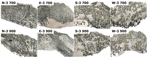 Figure 3. 3D models for the different aspects (N, E, S, and W) and altitudes (3 700 and 3 900 m) in the study area.