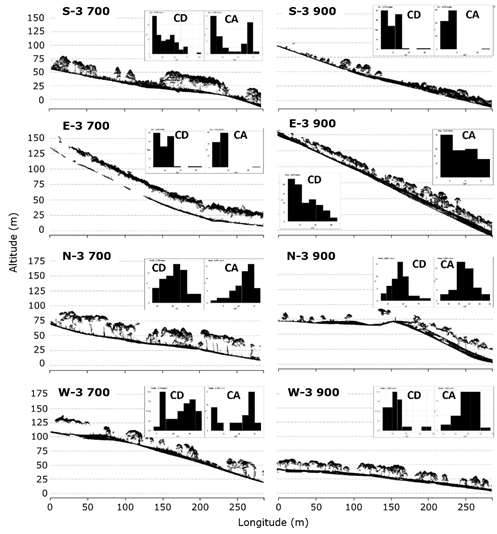 CD = Frequency of diametric categories grouped from left to right (smallest to largest); CA = Frequency of height categories from left to right (highest to lowest). The abbreviations in the figure correspond to the aspect (north, south, east, and west) and altitude (m).