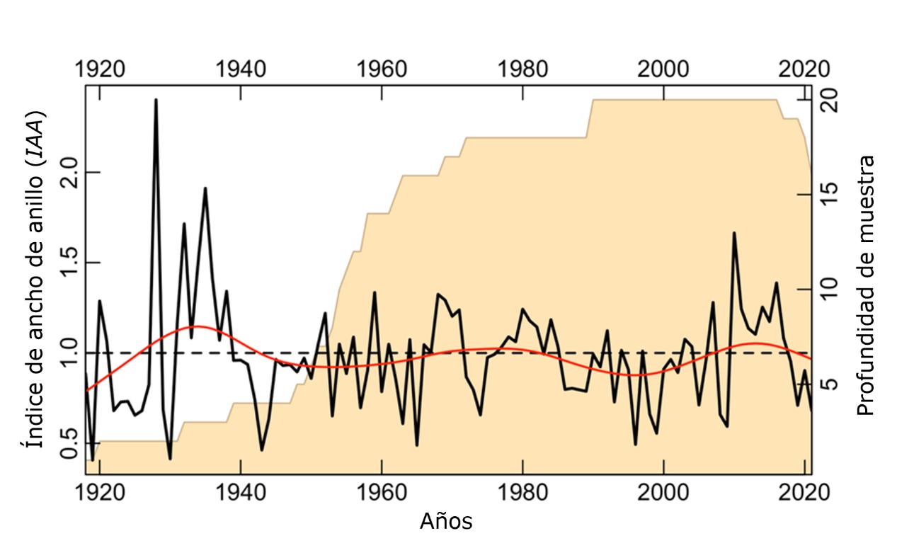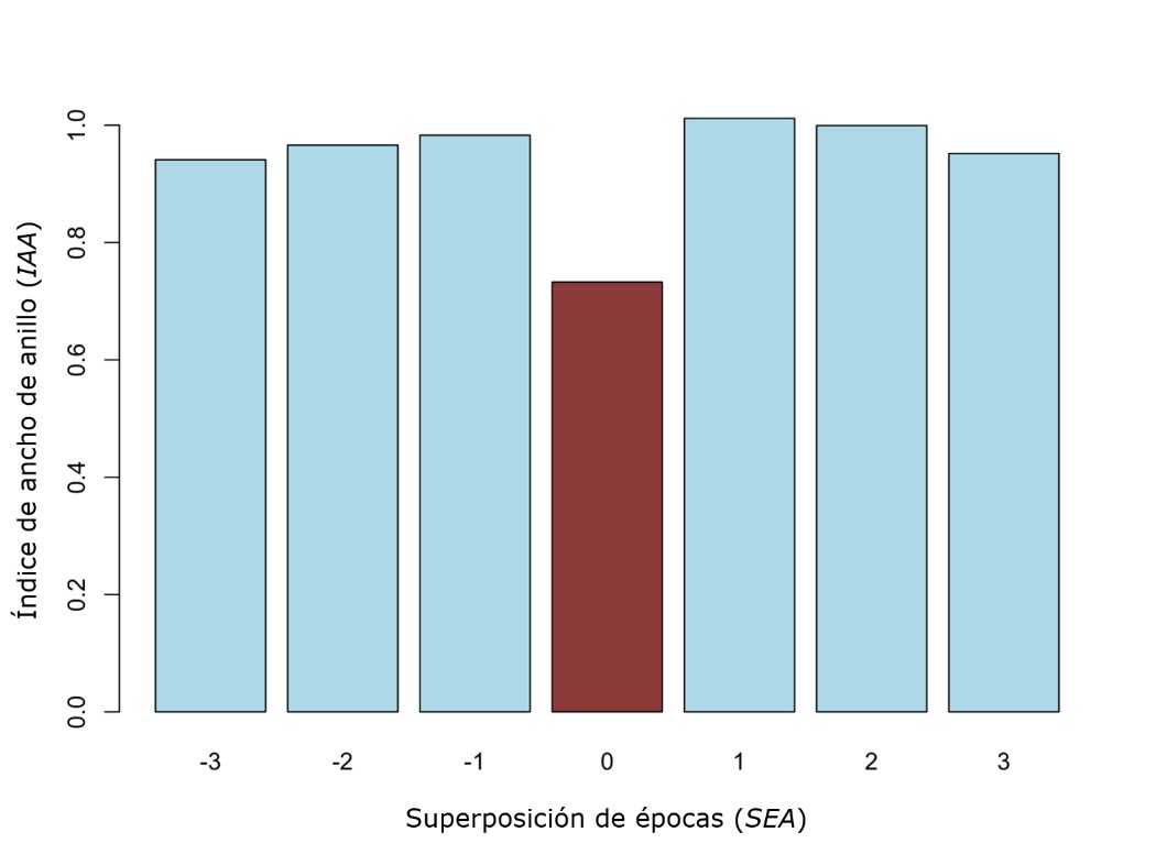 Los años que registraron bajos IAA (Figura 3) coincidieron con bajos registros en el sitio del índice de sequía de Palmer (PDSI) (Stahle et al., 2016). Asimismo, concordaron con los registros más bajos del índice estandarizado de precipitación-evapotranspiración (SPEI) (Vicente-Serrano et al., 2010) y el análisis de superposición de épocas (Figura 8).