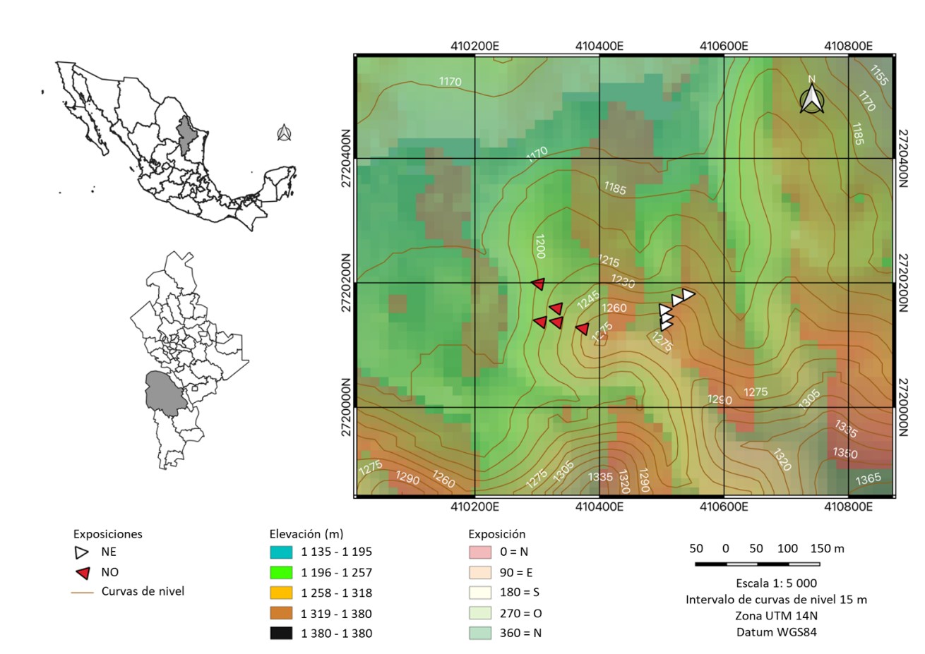 El estudio entre el clima y el crecimiento se ha abordado a través de indicadores basados en los anillos de crecimiento (Acosta-Hernández et al., 2017). Se han identificado disparidades en la respuesta de los índices de ancho de anillo (IAA) entre especies que coexisten en un mismo hábitat (González-Cásares et al., 2017) y entre aquellas establecidas en distintas ubicaciones geográficas (Pompa-García et al., 2017). Estas respuestas diferenciadas se atribuyen a condiciones microambientales, en las cuales la topografía, la pendiente y la exposición emergen como variables destacadas (Urrutia-Jalabert et al., 2021). Por lo tanto, las formas heterogéneas del relieve originan microhábitats caracterizados por condiciones ambientales específicas, incluso en áreas con un clima local semejante. Elementos como la altitud, pendiente y exposición desempeñan un papel crucial en la generación de condiciones que influyen en el establecimiento y crecimiento de las especies forestales, los cuales afectan la humedad, la disponibilidad de luz solar y la exposición al viento, entre otros (Resler et al., 2005; Sundqvist et al., 2013; Pyatt et al., 2016).
