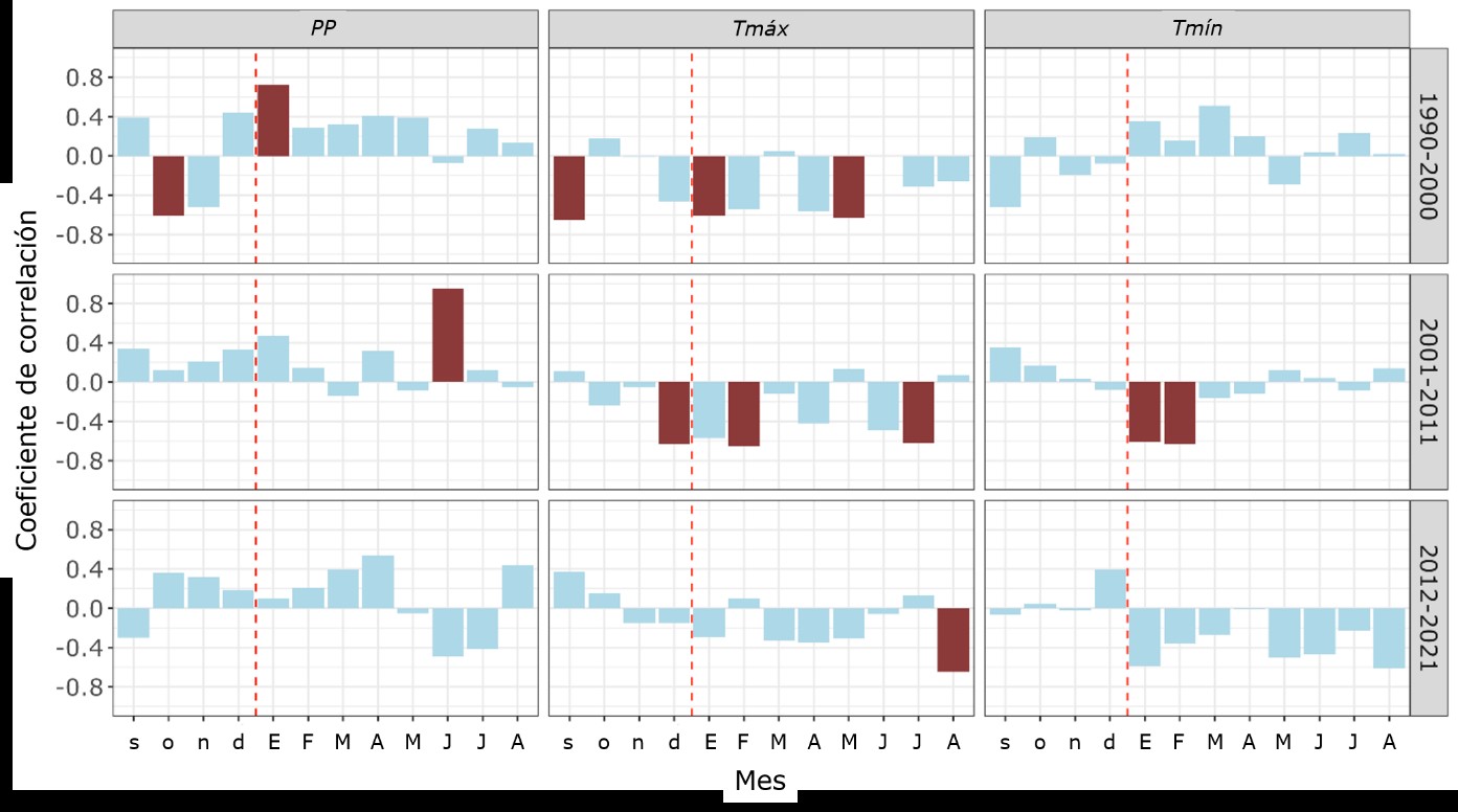Al considerar el periodo 1990-2021, se determinaron correlaciones significativas entre las variables climáticas y el IAA. La precipitación de diciembre previo al año de crecimiento, así como la de enero y abril en el año de crecimiento, se correlacionó positiva y significativamente con el IAA. La temperatura máxima de diciembre previo al año de crecimiento y de enero, febrero y abril en el año de crecimiento, se correlacionó negativa y significativamente con el IAA (Figura 4).
