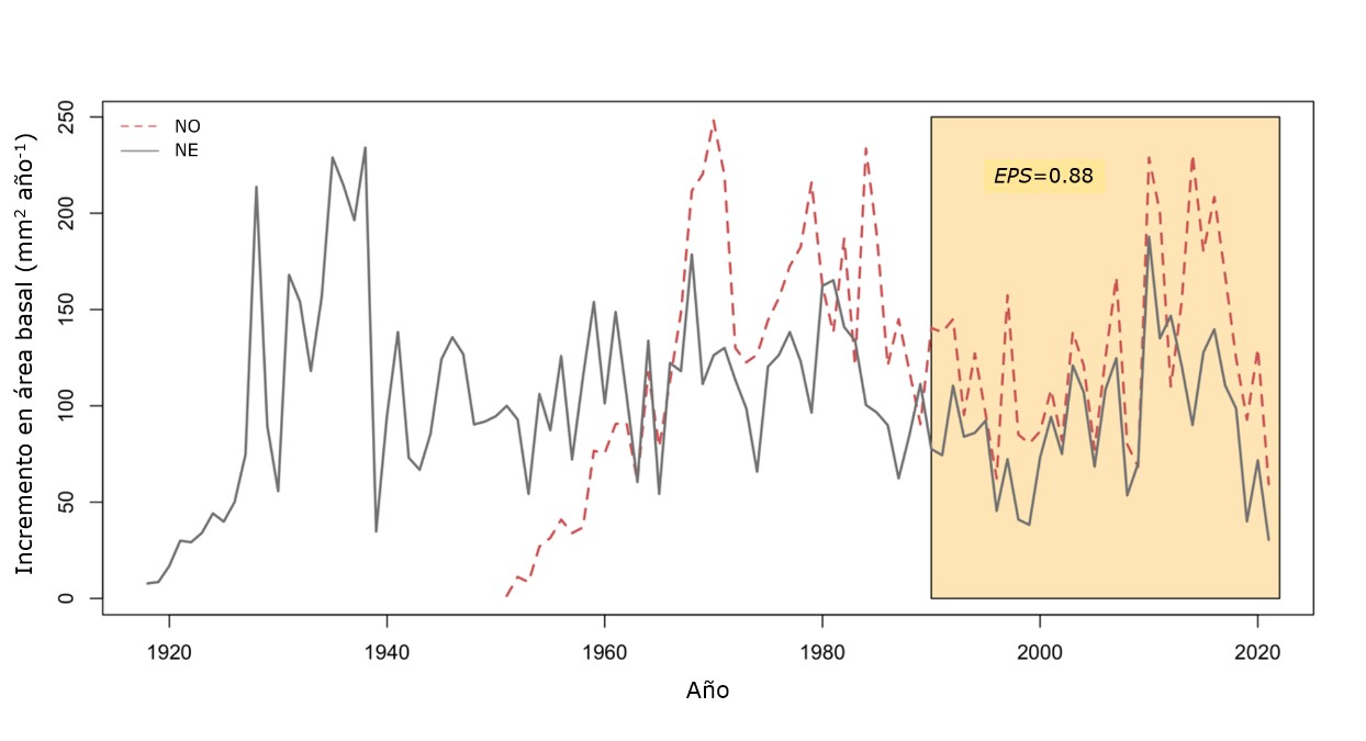 El análisis de U de Mann-Whitney reveló diferencias significativas en el incremento de área basal entre exposiciones (p<0.001) para el periodo 1990-2021 (Figura 6). Los árboles de Pinus arizonica en la exposición noroeste presentaron un IAB medio significativamente mayor (224.7 mm2 año-1) en comparación con los árboles expuestos en la dirección noreste (143.9 mm2 año-1).