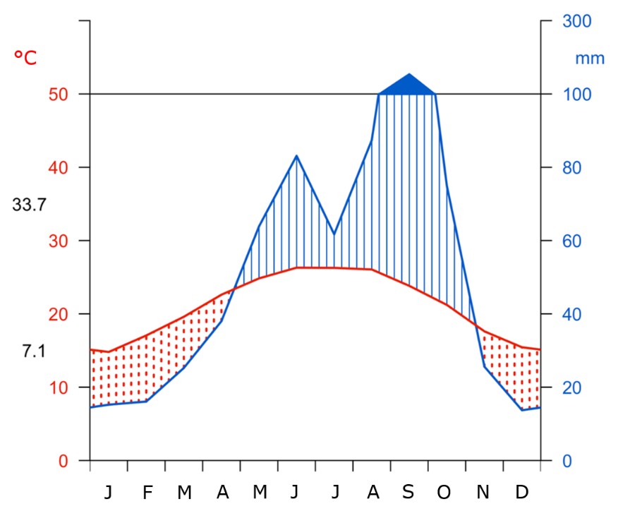 Figure 2. Walter-Lieth climate graph for precipitation and mean monthly temperature for the period 1990-2022.