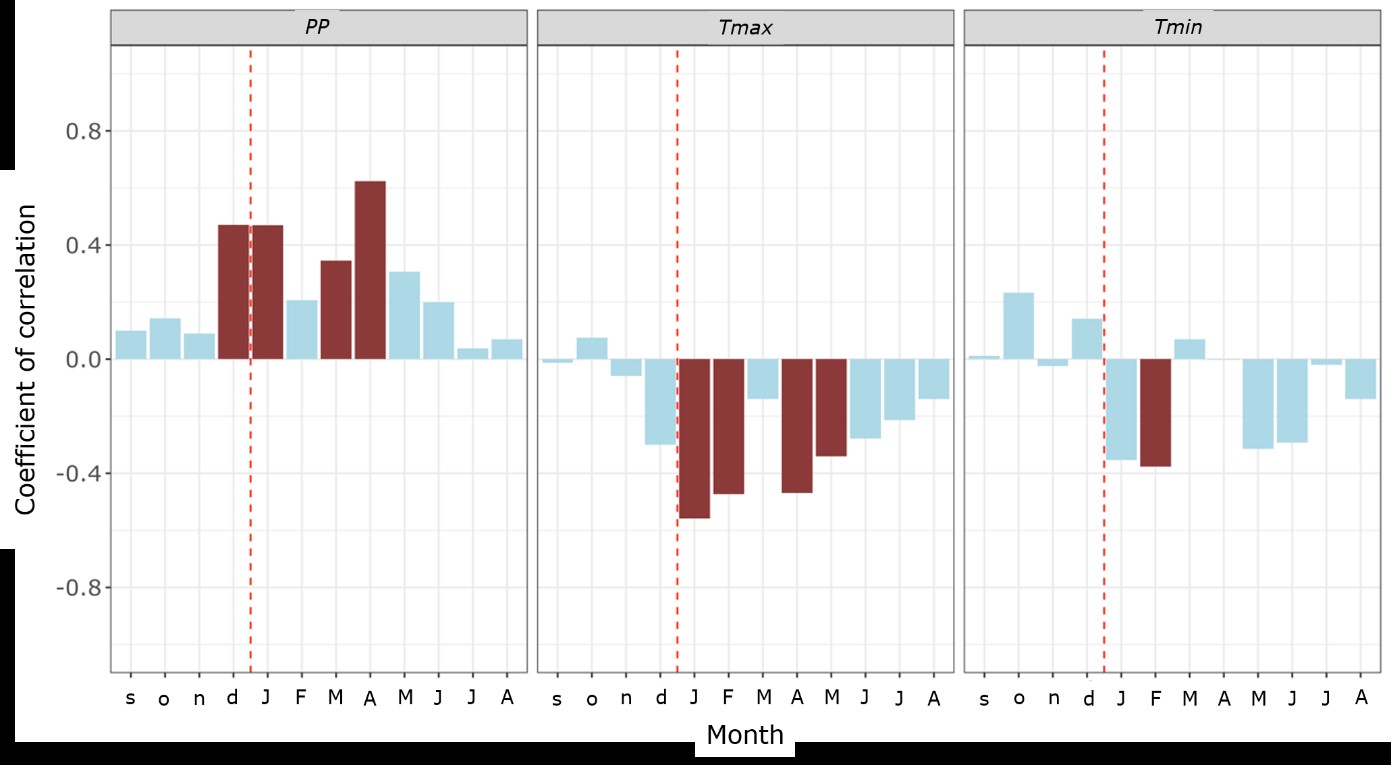 PP = Accumulated monthly precipitation; Tmax = Average maximum temperature; Tmin = Average minimum temperature. Significant correlations (95 %) are represented by red bars. Months in lower case correspond to the previous year of growth, and those in uppercase, to the current year of growth.