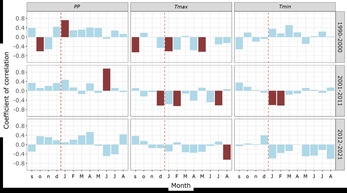 The RWI responds negatively and significantly to the Tmax of different months between periods. For the 1990-2000 period, it was to the Tmax for January and May of the year of growth. Between 2001-2011, to the Tmax of the previous December, as well as to the Tmax of February and July of the year of growth. In the period 2012-2021, to the Tmax of August of the year of growth. Tmin only negatively and significantly affected the RWI in the 2001-2011 period, particularly, the Tmin for January and February of the year of growth.