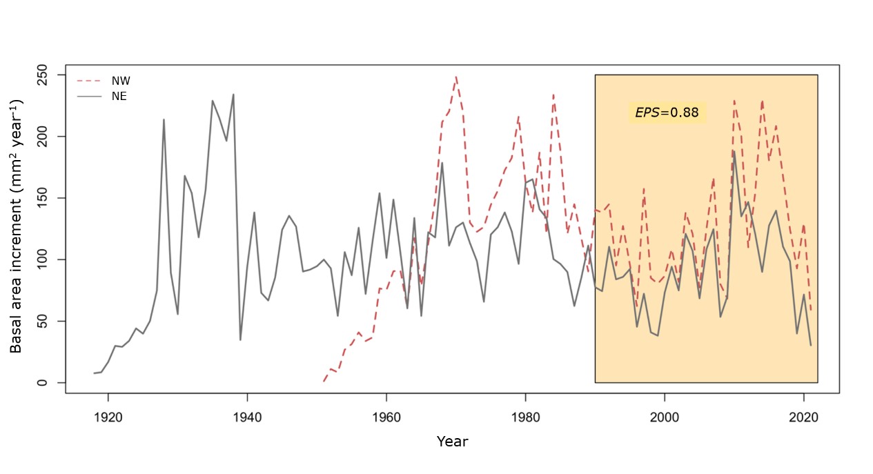 The Mann-Whitney U analysis revealed statistically significant differences in basal area increment between exposures (p<0.001) for the 1990-2021 period (Figure 6). Pinus arizonica trees with a northwest exposure showed a significantly higher mean BAI (224.7 mm2 yr-1) compared to trees exposed in the northeast direction (143.9 mm2 yr-1).
