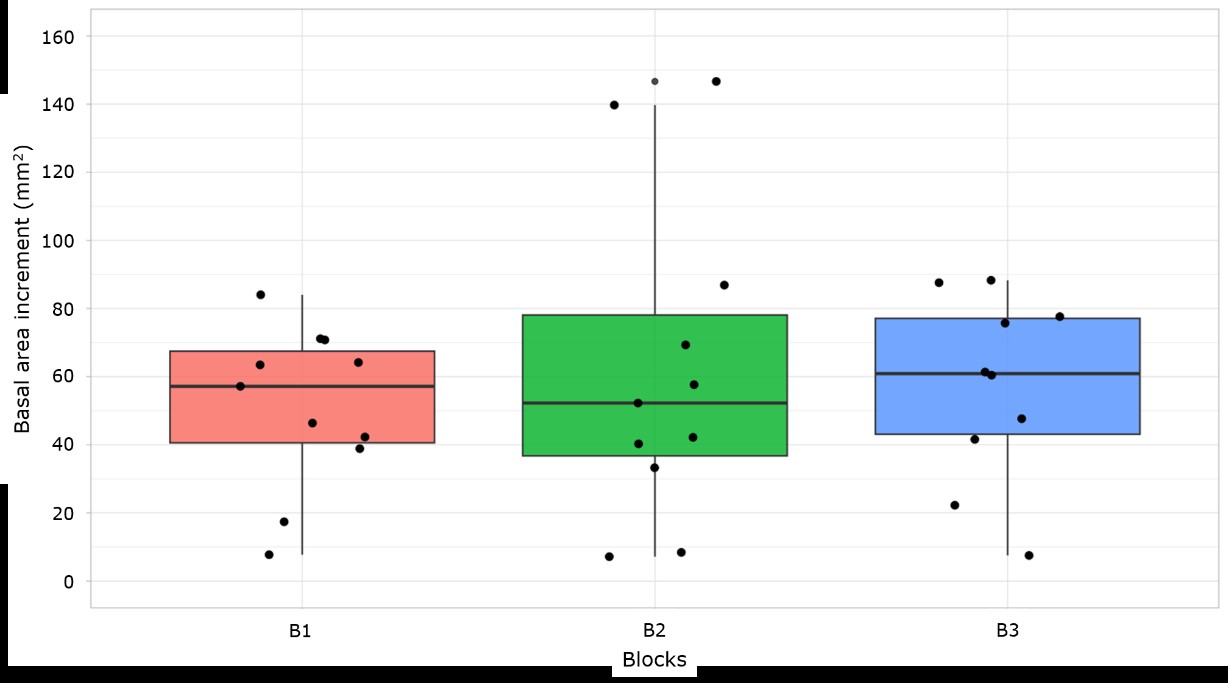 The Kruskall-Wallis test showed significant differences in the basal area increment between growth time periods (p<0.001) (Figure 7). Dunn's multiple comparison test indicated that the BAI in the 2001-2011 (B2, 62.1 mm2 yr-1) and 2012-2021 periods (B3, 56.9 mm2 yr-1) did not show a significant difference between each other (p>0.05). However, both B2 and B3 exhibited significant differences (p<0.05) in BAI compared to the 1990-2000 period (B1, 51.2 mm2 yr-1).