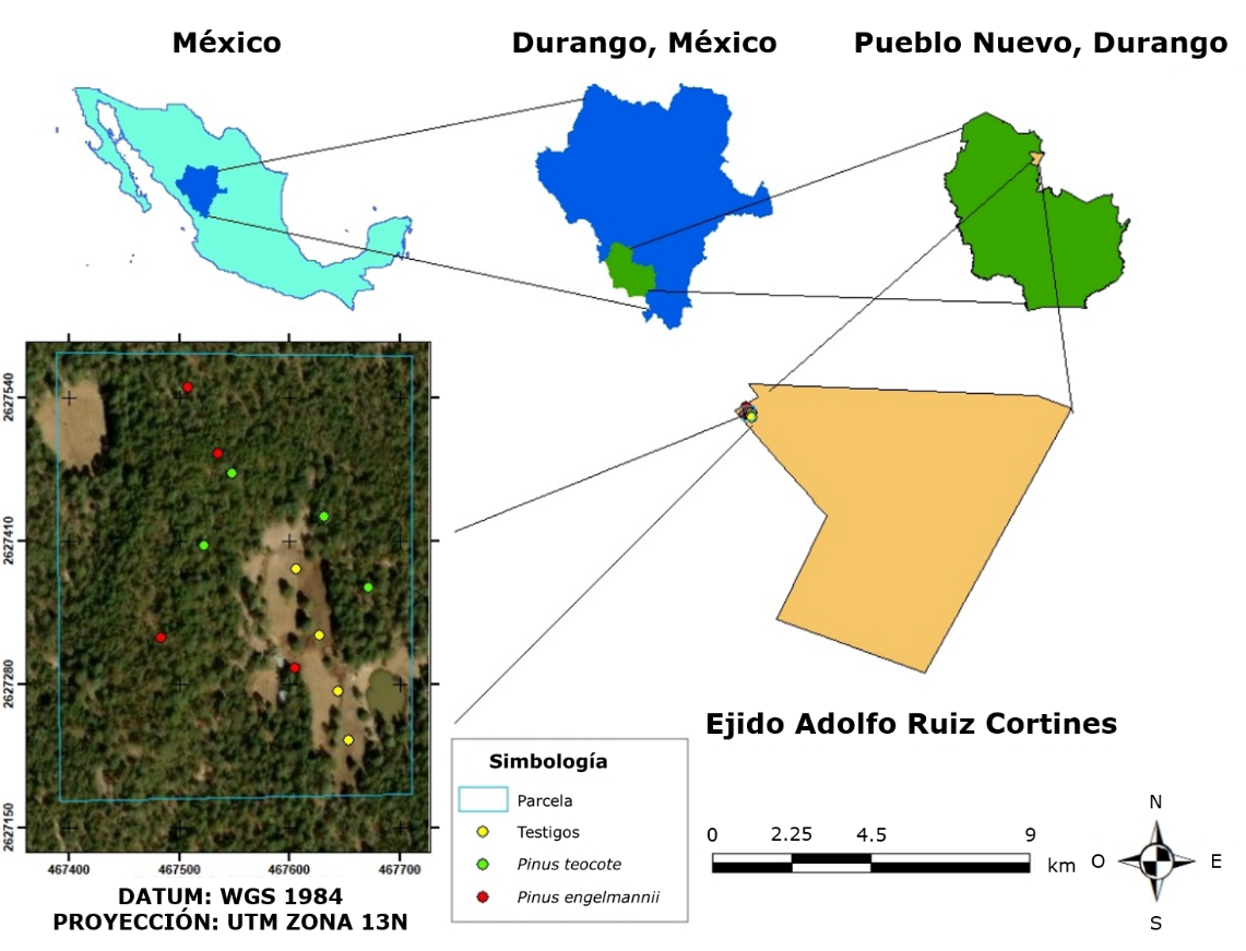 La investigación se llevó a cabo en el ejido Adolfo Ruiz Cortines, municipio Pueblo Nuevo, Durango, México. Se localiza en la región suroeste del estado de Durango, en la Sierra Madre Occidental, como parte de la subprovincia denominada Cañones Duranguenses, 20 km al sureste de la ciudad de El Salto, Durango, a una mediana altura de 2 480 msnm (INEGI, 2014), su acceso es a través de la carretera Durango-Mazatlán, y geográficamente se localiza en las coordenadas UTM Zona 13N 0467600, 2627410 (Figura 1).