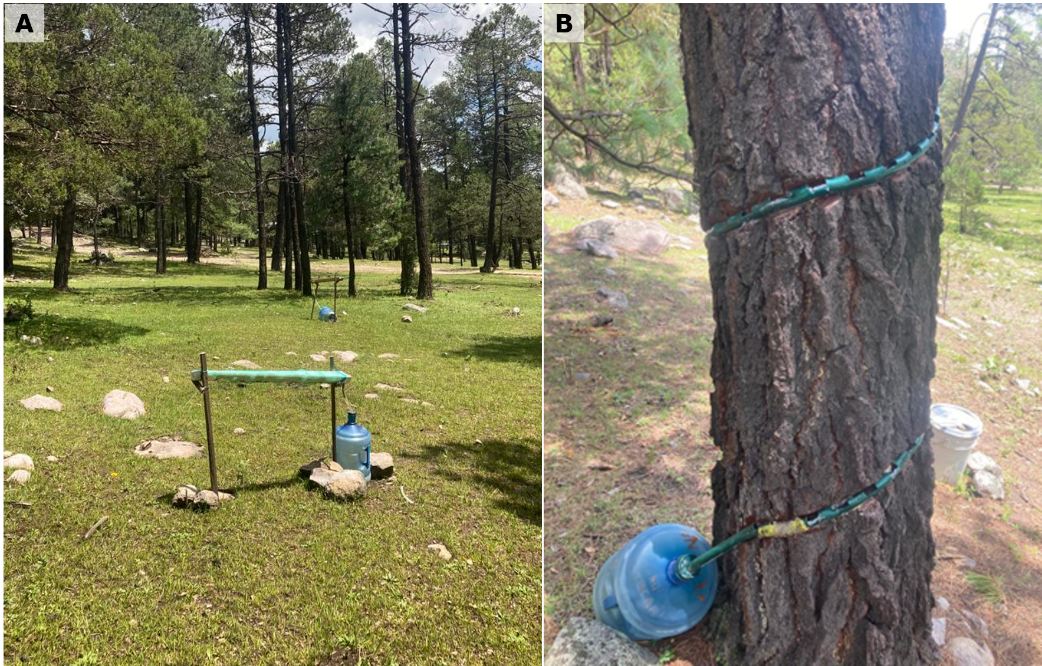 En el registro del escurrimiento fustal se utilizaron los mismos cuatro árboles por especie que se usaron para medir la precipitación directa, se emplearon mangueras de plástico (marca TRUPER®, modelo MAN-1R) de 3 cm de diámetro, una manguera por árbol, con perforaciones de 1.5×2.5 cm, retiradas entre sí a distancias de 4 cm, pegadas a los fustes a 1 m de altura y colocadas de manera espiral, de tal manera que dieran dos vueltas y media al tronco, se fijaron con clavos de 1” y sellaron con silicón por donde se transportaba el agua a los botes de recolecta (Figura 2B) (Cantú y González, 2002). Se mantuvieron fijas en los árboles seleccionados durante todo el periodo experimental. En la Figura 1 de la ubicación de área de estudio se observa la ubicación y distribución de los árboles dentro de la parcela de estudio.
