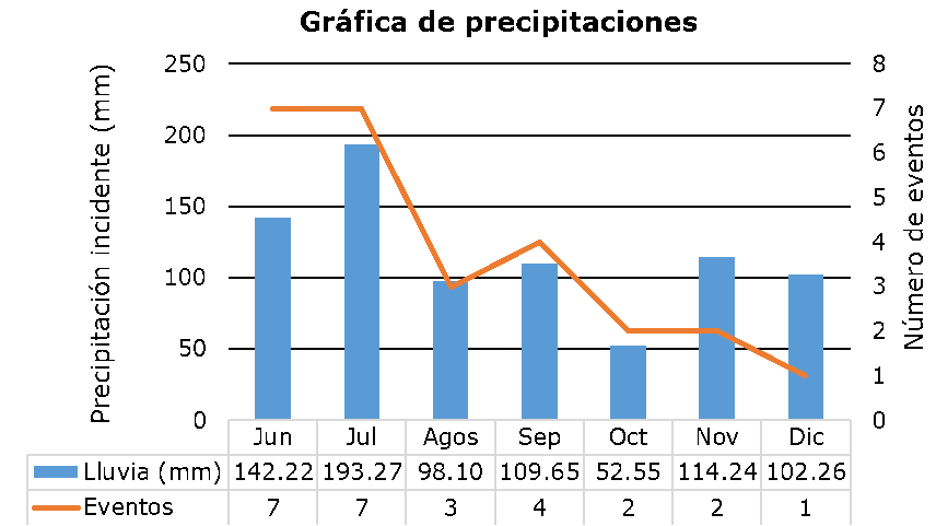 Figura 3. Número de eventos y precipitación mensual durante el periodo de estudio.