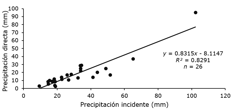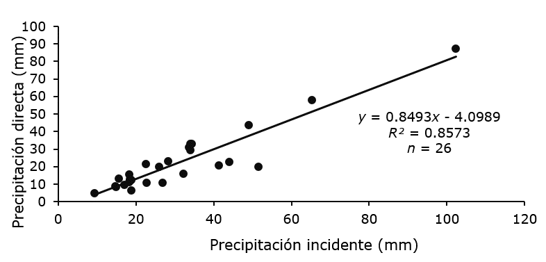 Figura 5. Relación entre la precipitación incidente y la precipitación directa para Pinus engelmannii Carrière.