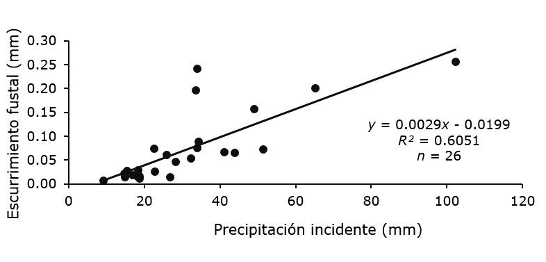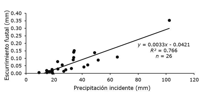 Figura 6. Relación de la precipitación incidente y el escurrimiento fustal para Pinus teocote Schltdl. & Cham.