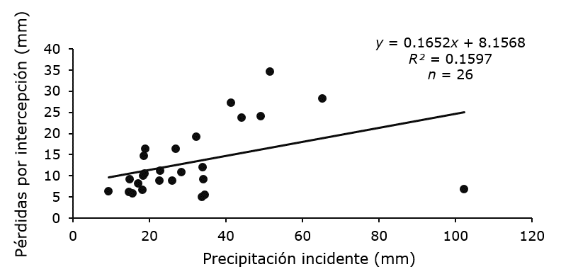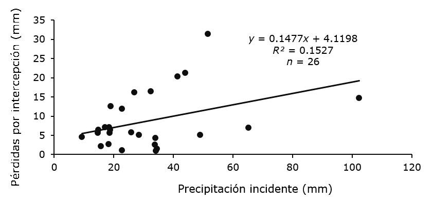 El análisis de las pérdidas por intercepción para cada especie se estimó como la diferencia entre la precipitación incidente y la suma de la precipitación directa y el escurrimiento fustal, mediante la aplicación de estadística descriptiva y análisis de regresión lineal con la siguiente fórmula (Cantú y González, 2005):
