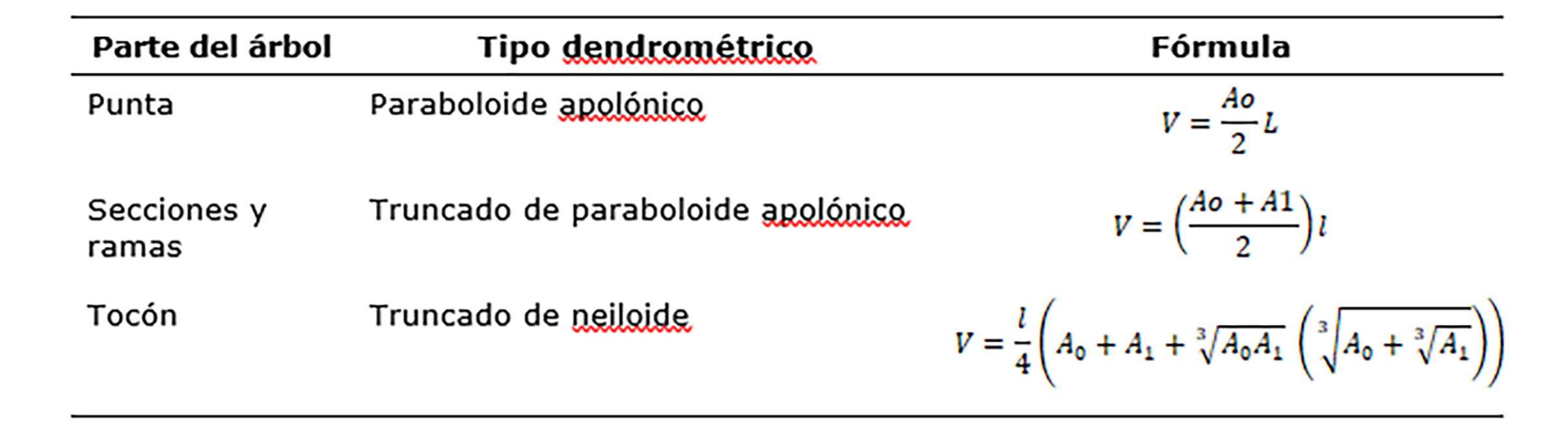 El volumen de cada sección se calculó con base en el tipo dendrométrico correspondiente (Cuadro 1), a excepción del volumen de ramas y ramillas con diámetro menor a 5 cm, el cual se estimó mediante una relación peso/volumen para después ajustar un modelo de regresión. El volumen total del árbol con corteza (Vta) se estimó sumando el volumen de tocón+volumen de tronco+volumen de punta+volumen de copa en ramas con diámetros mayores a 5 cm+volumen de ramas y ramillas con diámetros menores a 5 cm. El volumen fustal con corteza (Vf) se obtuvo sumando volumen de tocón+volumen de tronco+volumen de punta.