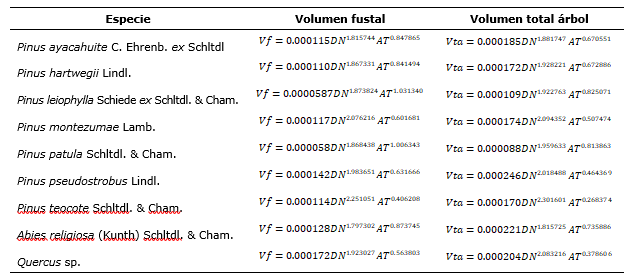 Los volúmenes fustales o totales, generalmente se estiman a partir de funciones lineales y no lineales. Algunas ecuaciones alométricas citadas en la literatura incluyen: Variable combinada, Korsun, Schumacher-Hall, Australiana, Meyer modificada, Naslund, Takata, Comprensible, Logarítmica, Thornber, Berkhout, Honer y Wenk (Clutter et al., 1983; Romahn et al., 1994; Prodan et al., 1997). Dada su precisión y sencillez, el modelo de Schumacher-Hall es uno de los más utilizados (Corral-Rivas y Návar-Cháidez, 2009; Vargas-Larreta et al., 2018).