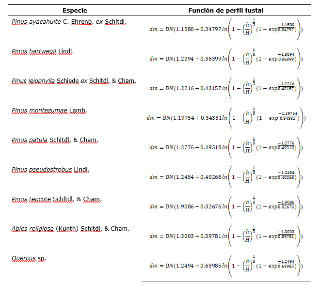 Durante las últimas dos décadas, en México se han generado ajustes de funciones de ahusamiento y volumen comercial para el ecosistema templado en diversas especies de árboles: Abies religiosa (Kunth) Schltdl. & Cham. en varias regiones del país (Guzmán-Santiago et al., 2022); Pinus greggii Engelm. ex Parl. en Hidalgo (Hernández-Ramos et al., 2017); Quercus sideroxyla Bonpl. en Durango (Quiñonez-Barraza et al., 2019); Quercus sp. en Puebla (Tamarit et al., 2017); Pinus pseudostrobus Lindl. en Nuevo León (Flores et al., 2021); Pinus oocarpa Schiede ex Schltdl. y Pinus douglasiana Martínez en Durango (López et al., 2015); Pinus teocote Schltdl. & Cham. en Nuevo Léon (Tapia y Návar, 1998); Pinus cooperi C. E. Blanco, Pinus durangensis Martínez, Pinus engelmannii Carrière, Pinus leiophylla Schiede ex Schltdl. & Cham., Pinus herrerae Martínez, Pinus ayacahuite C. Ehrenb. ex Schltdl., Pinus arizonica Engelm. y Pinus teocote en Durango (Corral et al., 1999; Quiñonez-Barraza et al., 2014); Pinus ayacahuite en Oaxaca (Ramírez-Martínez et al., 2018); Pinus cooperi en Durango (Cruz-Cobos et al., 2008), entre otros.