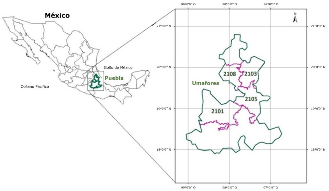 El estudio se realizó en áreas con aprovechamiento forestal maderable de Puebla, México, específicamente en las Unidades de Manejo Forestal (Umafor): 2101 “Izta Popo” (642 676 ha), 2103 “Teziutlán” (324 329 ha), 2105 “Centro y Pico de Orizaba” (414 817 ha) y 2108 “Chignahuapan-Zacatlán” (271 853 ha) (Conafor, 2023). Estas se localizan entre los 97°10’ y 98°45’ longitud oeste y 18°10’ y 20°15’ latitud norte (Figura 1). En interacciones, mediante cursos de capacitación y captación de demandas, con prestadores de servicios técnicos forestales, productores y funcionarios de gobierno se identificaron las especies de importancia forestal maderable para Puebla: Pinus ayacahuite, P. hartwegii, P. leiophylla, P. montezumae, P. patula, P. pseudostrobus, P. teocote, Abies religiosa y Quercus sp.