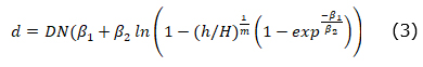 dm = Diámetro a una altura determinada del fuste (cm); DN = Diámetro normal con corteza (cm); H = Altura total (m); h = Altura determinada para estimación con respecto al suelo (m); exp = Constante exponencial; ln = Base de los logaritmos neperianos.