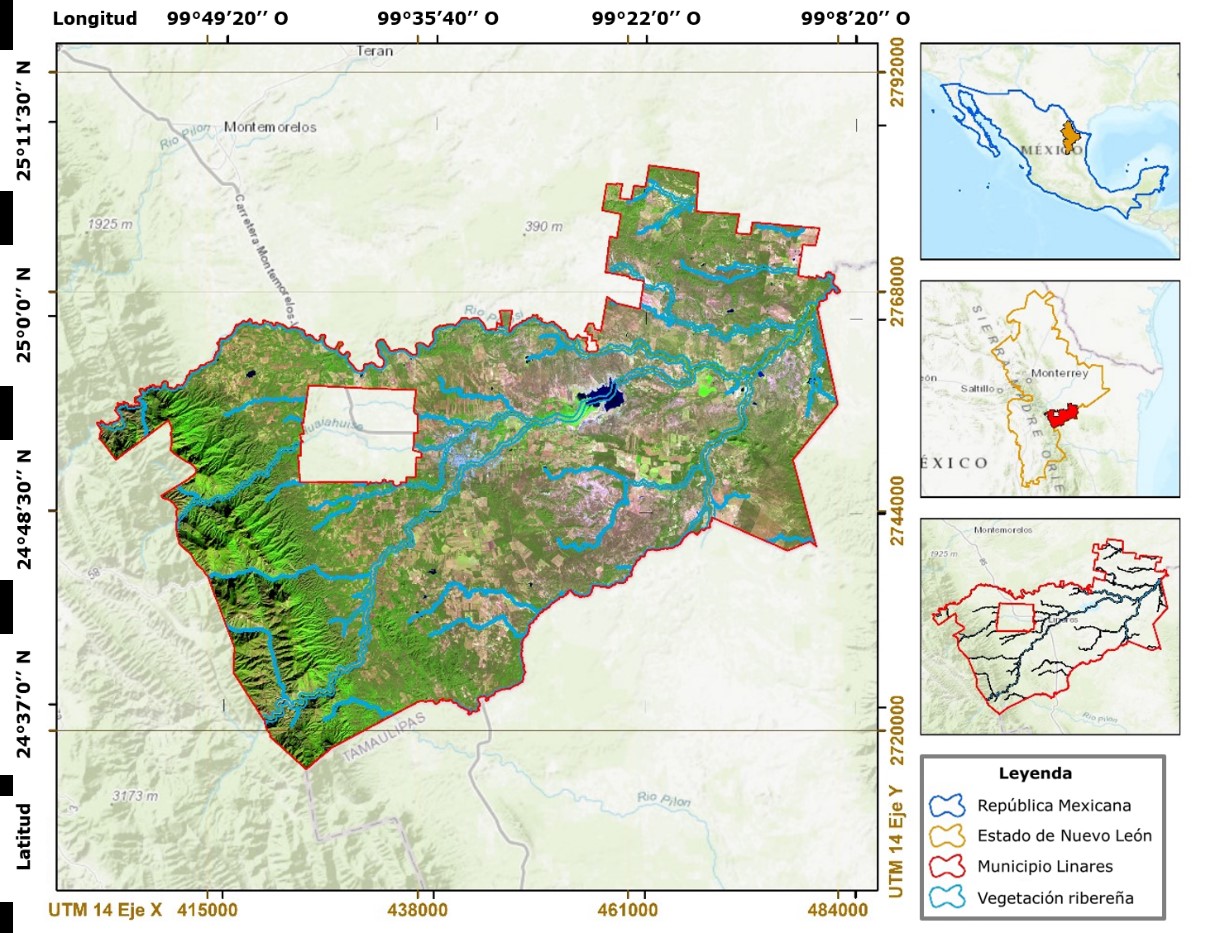 Figura 1. Localización del municipio Linares, Nuevo León, delimitado en color rojo y la vegetación ribereña en color azul celeste.