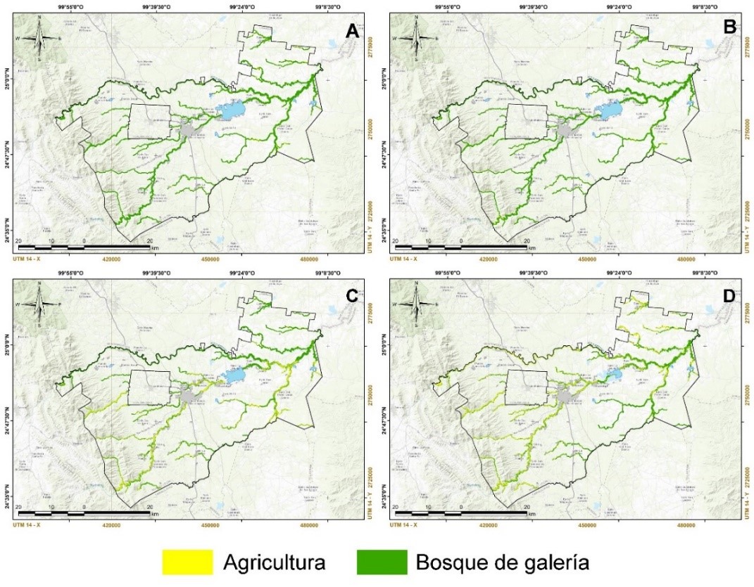 De acuerdo a los resultados de este estudio, en 27 años (1995-2022), 13.91 % de la superficie de bosques de galería del municipio de interés se transformó para uso agrícola, con tasas de cambio de -0.55 y 0.51 %, respectivamente. Al comparar esos datos con investigaciones similares realizadas en México, se reconoció una concordancia con lo consignado por Treviño et al. (2001) para los ríos Cabezones y Ramos, localizados en el centro-sur de Nuevo León; en 19 años (1975-1994) los bosques de galería presentaron tasas de cambio de -0.49 y -0.45 %; por el contrario, para las áreas dedicadas a la agricultura fueron de 1.64 y 1.14 %, respectivamente. Lo anterior coincide con las aportaciones de Leija et al. (2020), quienes realizaron un análisis de cambio en la cobertura vegetal y uso de suelo en la parte baja de la cuenca del Río Nazas en la región centro-norte de México y concluyeron que en 26 años (1990-2016), el bosque de galería experimentó una tasa anual de cambio de -2.1 %, a diferencia de la agricultura que fue de 2.1 %.