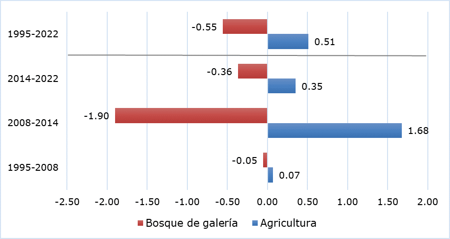 En 1995, los bosques de galería cubrían una superficie de 9 203.26 ha, mientras que para la agricultura era de 9 818.47 ha (Cuadro 1). En 27 años (1995-2022), los bosques de galería presentaron una pérdida de cobertura de 1 280.31 ha (-13.91 %), contrario a la agricultura que tuvo un incremento de 1 453.06 ha (14.80 %) en ese mismo lapso (Cuadro 2).