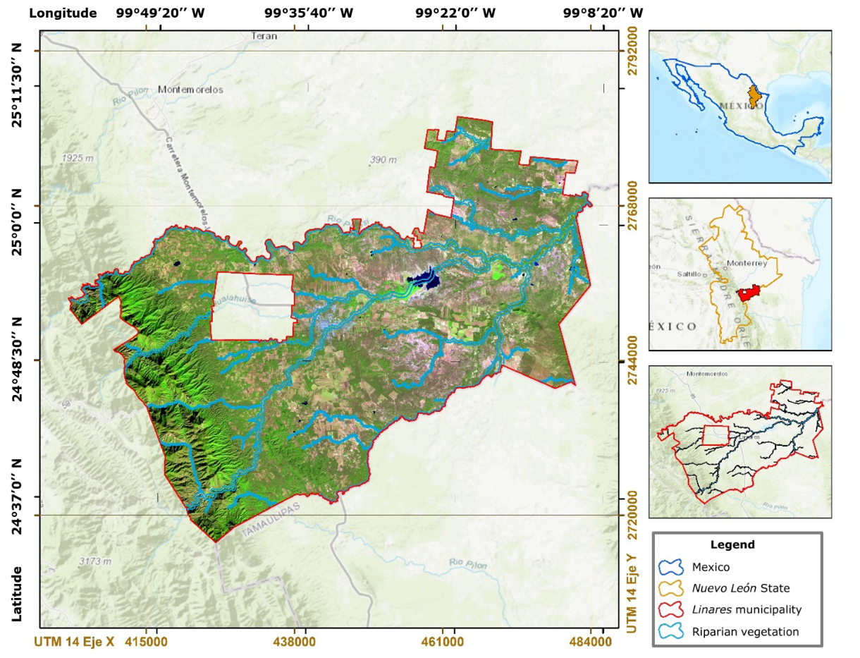 Figure 1. Location of Linares municipality, Nuevo León, delimited in red and the riverside vegetation in light blue.