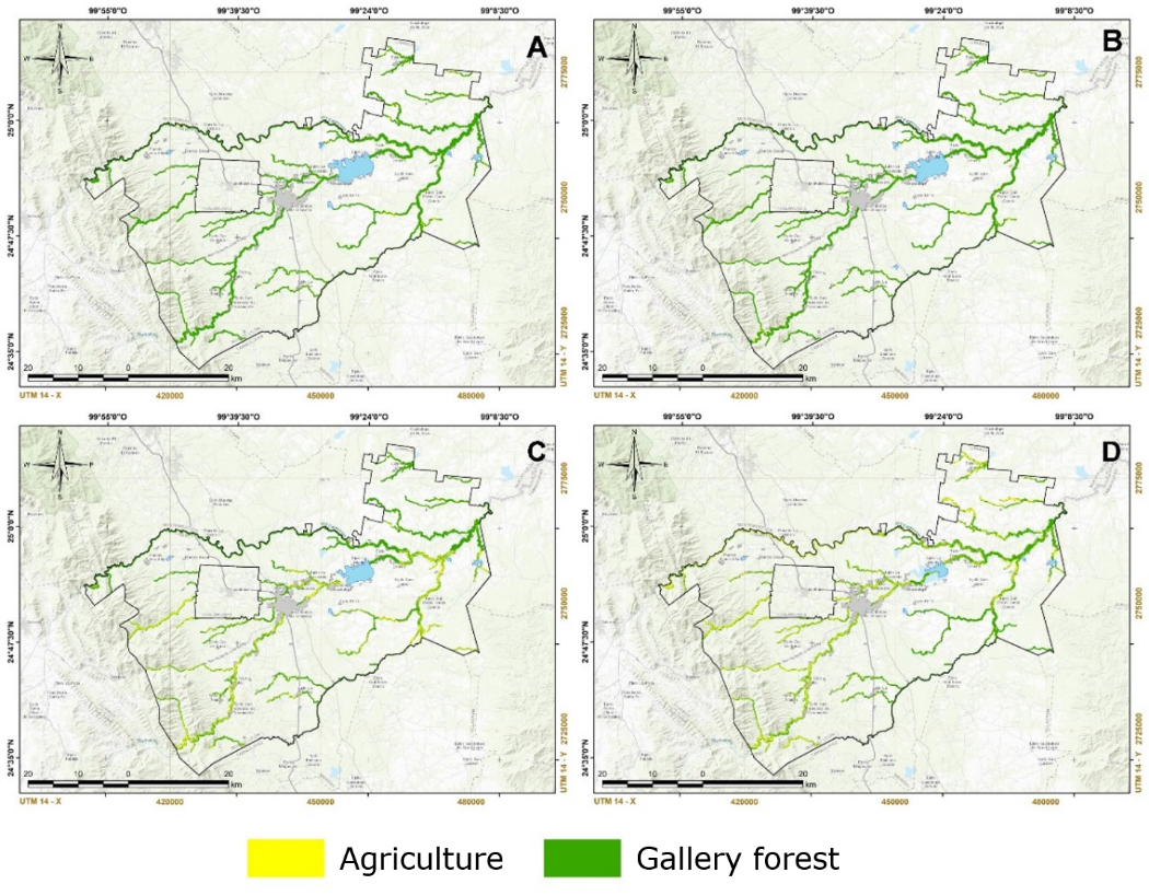 In conclusion, this multi-temporal analysis allowed us to know the current state of the gallery forests in Linares municipality, from which the loss of surface area as time passes to become agricultural areas is evident. It is important to stop this trend, since gallery forests play an important role in the protection of biodiversity, water and soil resources, which is why they must be recovered and conserved. Therefore, natural resource managers, as well as people involved in the formulation of public policies, must pay special attention to the decline of gallery forests and other plant ecosystems in Linares municipality and the state of Nuevo León, with the purpose of reducing its loss and conserving its ecosystem services.