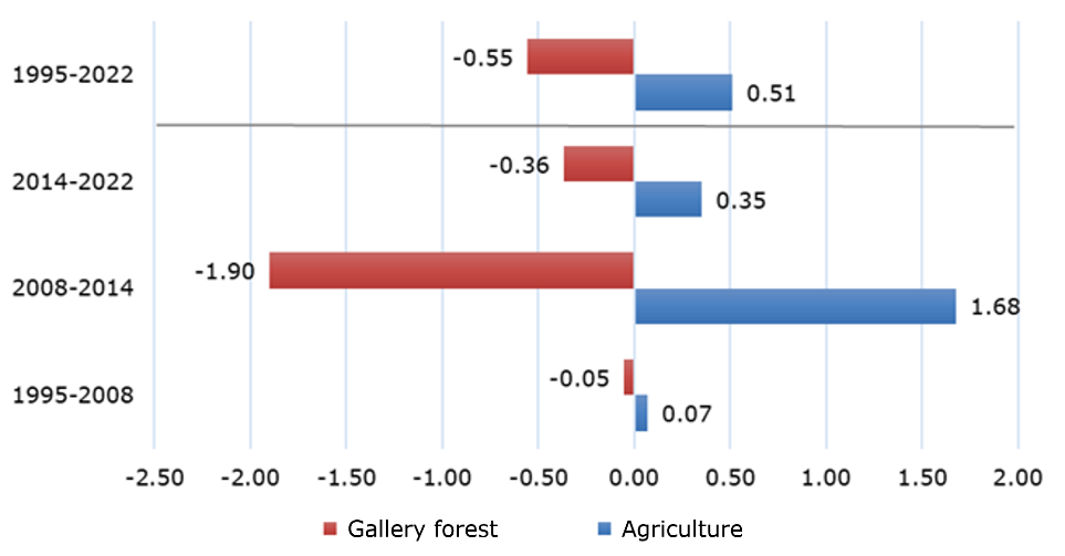 From 1995 to 2022, gallery forests recorded an annual rate of change of -0.55 %, the period from 2008-2014 showed the highest annual rate of change with -1.90 %, followed by the interval 2014-2022 with -0.36 %. Agriculture had a similar behavior in the different study periods, however, unlike gallery forests, the annual rate of change was positive (increased). During the entire time considered in the study (1995-2022), agriculture registered an annual rate of change of 0.51 %, from 2008-2014 the highest annual rate of change was verified with 1.68 %, followed by the period from 2014-2022 with 0.51 % (Figure 3).
