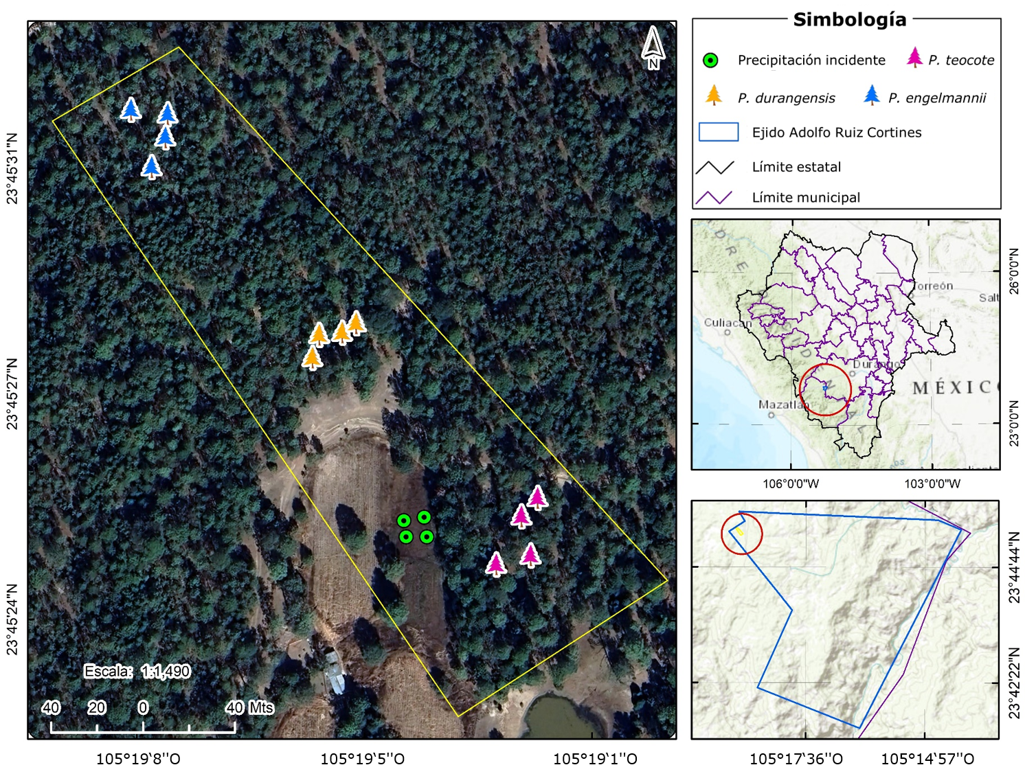 El estudio se realizó en el ejido Adolfo Ruiz Cortines, ubicado en la Gran Meseta de la Sierra Madre Occidental en la subprovincia denominada Cañones Duranguenses dentro del municipio Pueblo Nuevo, en el estado de Durango, México. Geográficamente, se sitúa entre las coordenadas 23°41' y 23°45' latitud norte y entre los 105°14' y los 105°19' de longitud oeste (Figura 1). El tipo de clima corresponde a Semifrío Subhúmedo con lluvias en verano, e intervalos de precipitación entre 5 y 10.2 mm (García, 2004). El régimen de lluvia en la región suele ser escaso, las mayores precipitaciones ocurren de junio a septiembre, con una precipitación media anual de 850 mm (Domínguez-Gómez et al., 2022). Las temperaturas en el sitio fluctúan de -0.9 °C en el mes de enero y 22.5 °C en agosto, con una evaporación media anual de 97.7 mm; datos obtenidos mediante un sensor automatizado tipo HOBO (FamiliaH8, Forestry Suppliers, Inc.®) ubicado en colindancia al sitio.