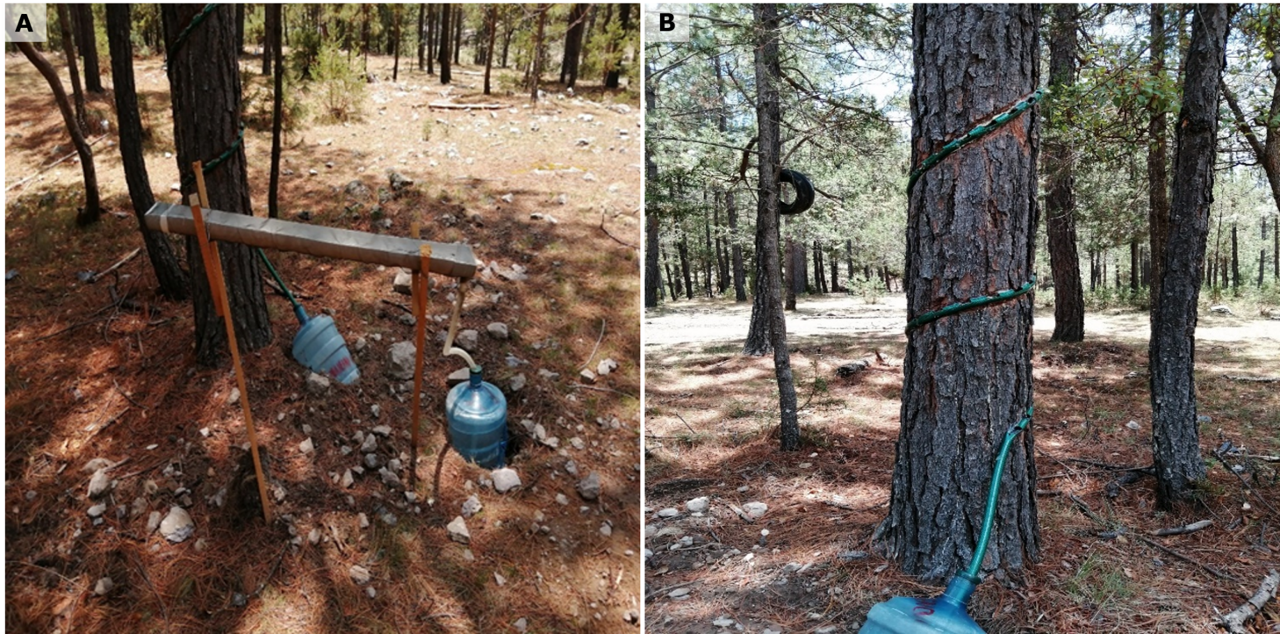 Escurrimiento fustal. Para llevar a cabo las mediciones del escurrimiento fustal, se usaron mangueras aceradas de plástico, con perforaciones de 1.5×2.5 cm, colocadas a cada 4 cm. Las mangueras se pusieron sobre los troncos desprovistos de corteza, en forma de espiral, en dos vueltas y media hasta alcanzar una altura máxima de 2 m. Con el fin de evitar la pérdida de lluvia, las mangueras fueron selladas con silicón en la parte superior e inferior (Figura 2B), y se colocaron en los mismos individuos seleccionados para la medición de la precipitación directa (Béjar et al., 2018).