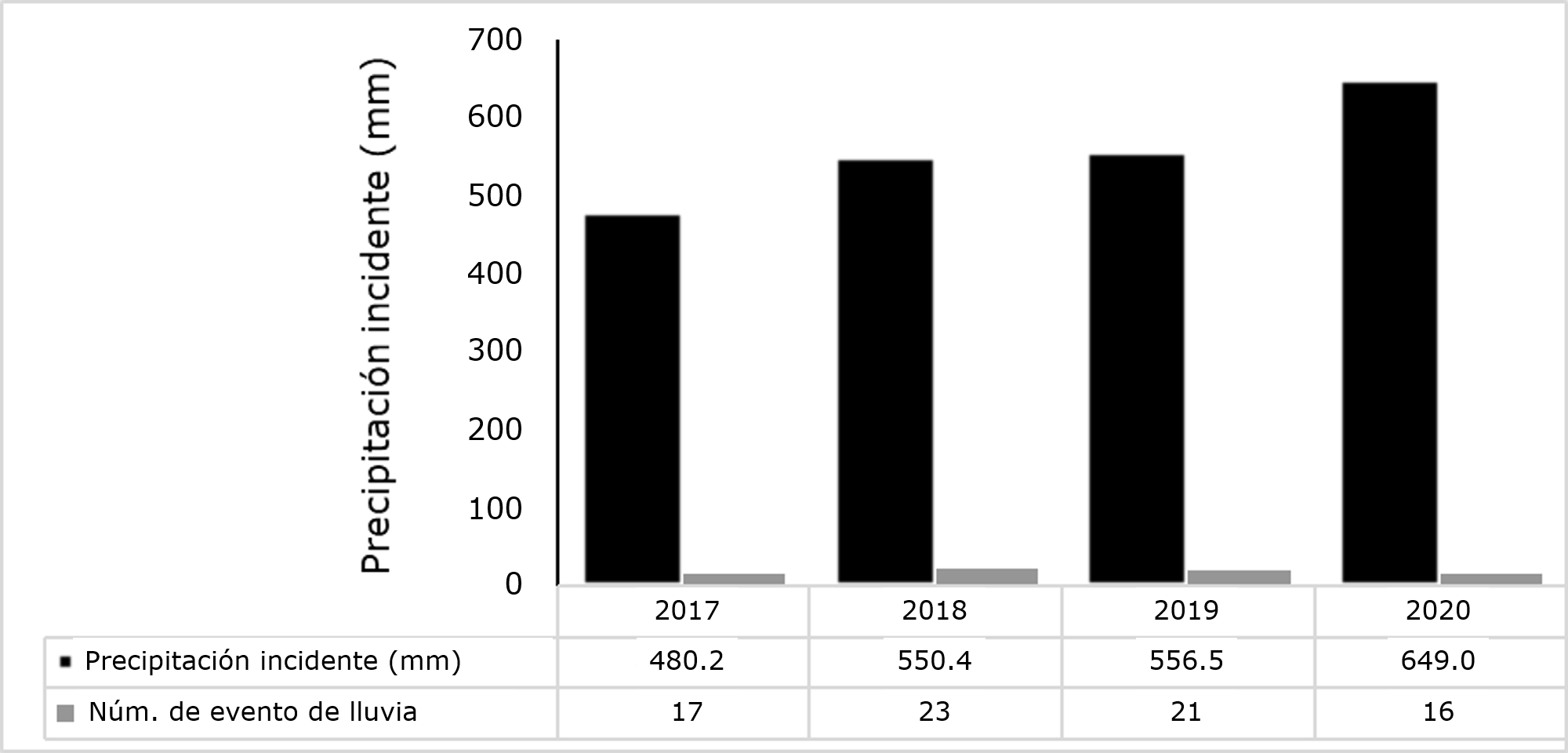 Durante los cuatro años de estudio (junio 2017-diciembre de 2020) se registraron 2 236.1 mm, distribuidos en 77 eventos de lluvia. Las precipitaciones acumuladas a lo largo del periodo de experimentación indicaron que el año 2018 presentó más número de eventos (23 eventos); sin embargo, la mayor lámina de lluvia se registró en 2020 (649.0 mm) (Figura 3), y representó 29 % del total acumulado.