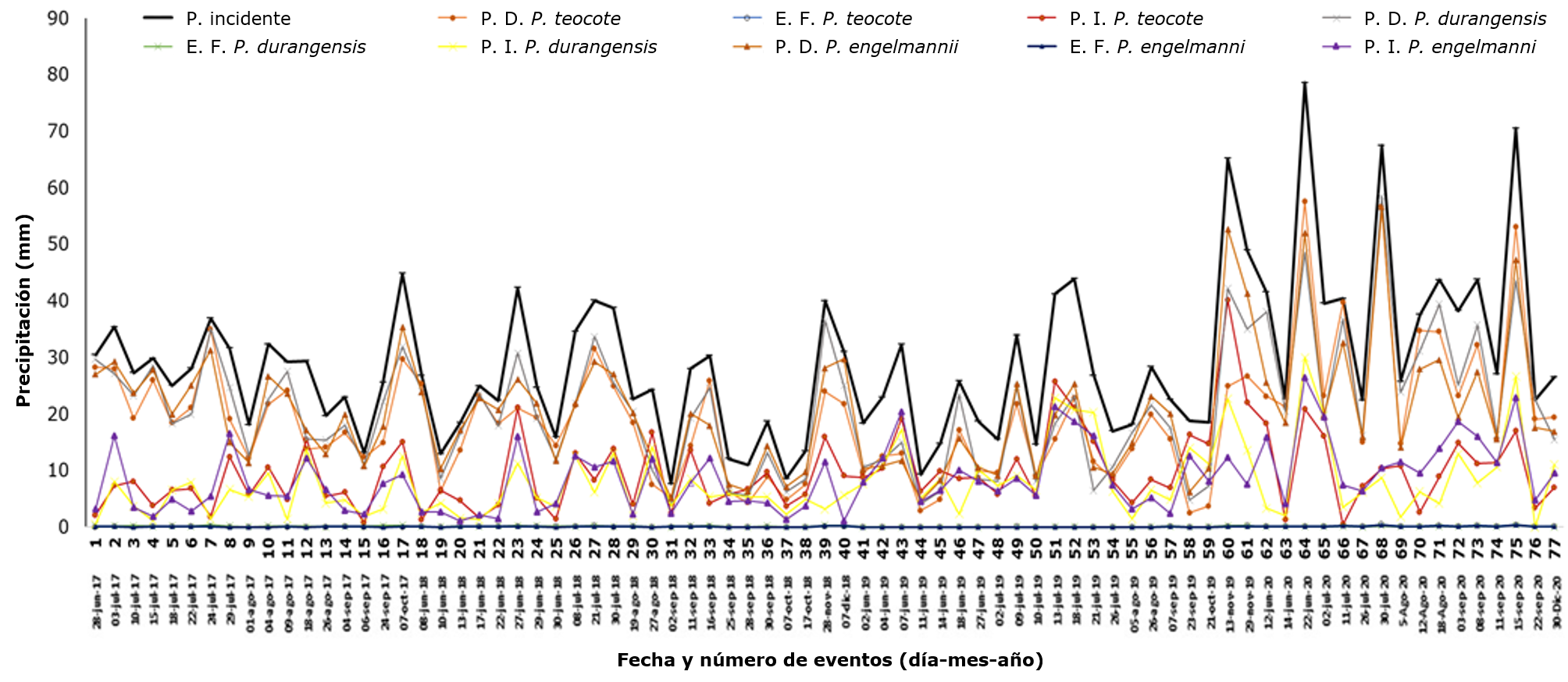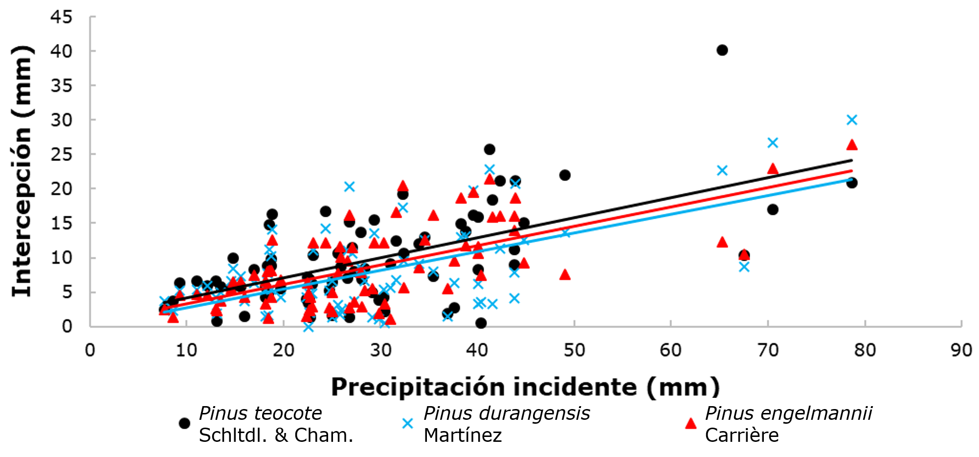 El porcentaje de la precipitación directa registrada fue de 72.4, 71.9 y 70.4 % para P. durangensis, P. engelmannii y P. teocote, respectivamente, lo cual fue en promedio 73.91 % del total de la precipitación incidente. El análisis de regresión lineal demostró que existe una aceptable relación entre la precipitación directa e incidente en cada una de las especies estudiadas. En los tres taxa, los valores de R2 fueron superiores a 0.70.