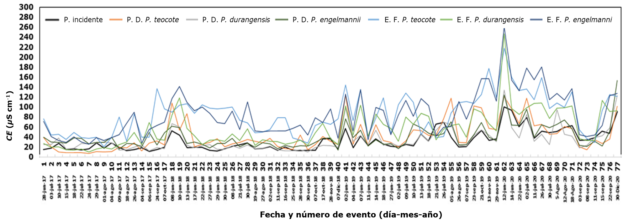 El resumen de los valores de la CE se muestra en el Cuadro 3. La precipitación incidente presentó 32.4 μS cm-1, que muestra un aumento en comparación con los valores para la precipitación directa en las tres especies estudiadas. Del análisis de los datos de la conductividad eléctrica (μS cm-1) del agua recolectada, el escurrimiento fustal tuvo un comportamiento más variado respecto a la precipitación directa, con valores por encima de la precipitación incidente debido principalmente a que se presenta una mayor incorporación de partículas y sedimentos durante el movimiento del agua a través del fuste y las hojas. Estos razonamientos permiten suponer diferencias en las composiciones químicas entre los diversos componentes, que se asocian a la presencia de diversas sales minerales e incorporación de partículas (Luna-Robles et al., 2019). Otro factor que altera el comportamiento de la conductividad eléctrica es la cantidad y arrastre de aniones corticales, ya que cuando la ocurrencia y la cantidad de eventos de lluvia disminuyen, se registra más acumulación de iones en la atmósfera, los cuales serán arrastrados por las lluvias posteriores (Pérez-Suárez et al., 2006).