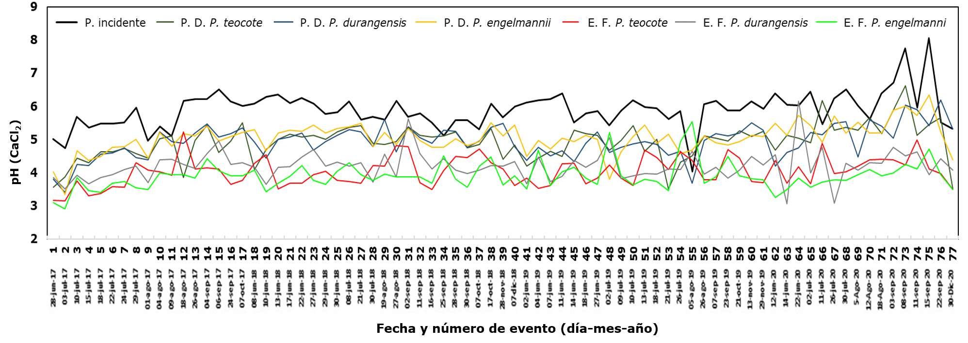En el Cuadro 3 se observa que el pH promedio para la precipitación incidente fue de 5.9, para la precipitación directa en las tres especies bajó a 5.0, mientras que en el escurrimiento fustal el valor alcanzó 4.1. Estudios como el realizado por Béjar et al. (2018), quienes estudiaron la redistribución de la precipitación y aporte de nutrimentos en Pinus cooperi C. E. Blanco, documentaron resultados con la misma tendencia; sus registros de pH para la precipitación incidente fueron entre 4.42 y 6.12, pero una vez que el agua fluyó por el dosel disminuyó ligeramente a 4.21, y una vez que el agua entró en contacto y fluyó por el fuste tendió a acidificarse y alcanzar cifras de 3.85.