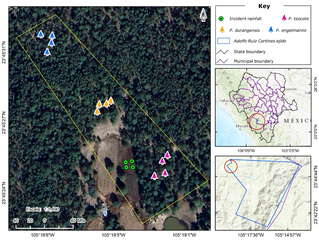 The study was conducted in the Adolfo Ruiz Cortines ejido, located in the Great Plateau of the Western Sierra Madre, in the sub province known as Cañones Duranguenses, within Pueblo Nuevo municipality, in the state of Durango, Mexico. Geographically, it is located between 23°41' and 23°45' N, and between 105°14' and 105°19' W (Figure 1). Its climate is Semi-cold Sub-humid with summer rains and rainfall intervals of 5 to 10.2 mm (García, 2004). Rainfall in the region is generally low, being heaviest from June to September, with an annual average of 850 mm (Domínguez-Gómez et al., 2022). Temperatures at the site fluctuate from -0.9 °C in January, to 22.5 °C in August, with an average annual evaporation of 97.7 mm. These data were obtained from an automated HOBO type sensor (H8 Family, Forestry Suppliers, Inc.®) located next to the site.