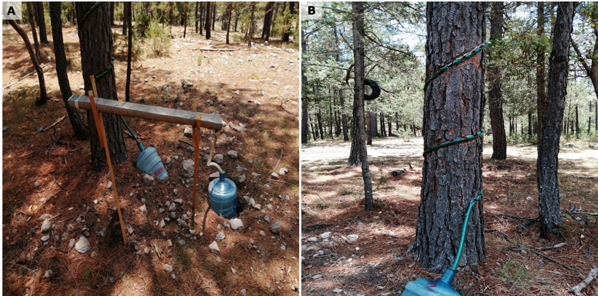 Direct rainfall. The same gutter design described above was followed. Four gutters were installed per plot of each species (one per individual), fixed in the lower part of the canopy of the selected trees, where they remained during the entire experimental period. The total number of gutters located within the study site was 12.