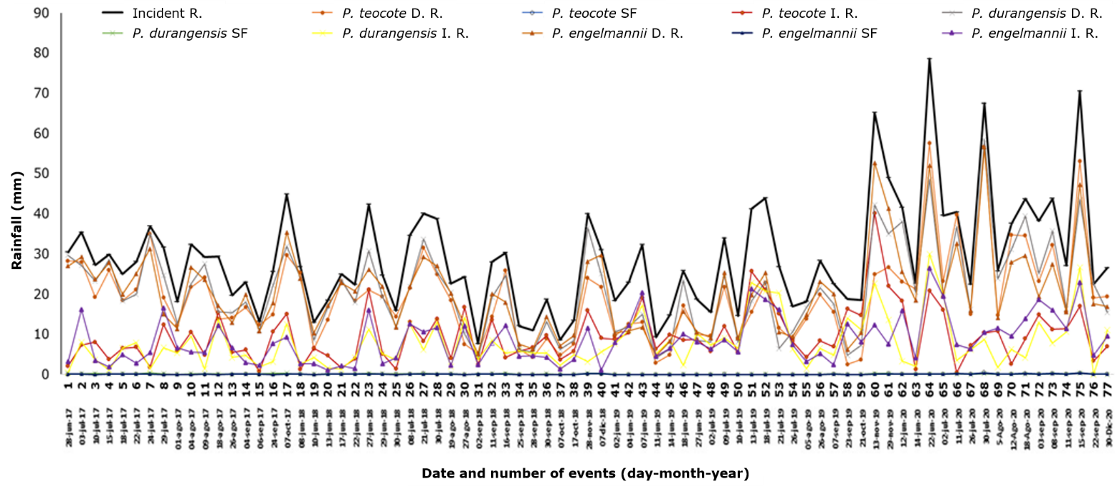 The individual analysis of total rainfall, direct rainfall, stemflow, and interception in each event showed little variability (Figure 4). The highest rainfall accumulation occurred during the last period, from event 60 onwards; event 64 had the highest accumulated water for the three species. In contrast, the lowest accumulation occurred in event 31. The events with a greater rainfall show that, as the amount of incident rainfall increases, the values in the other redistribution pathways increase as a result of water runoff in the various components of the forest canopy. Yáñez-Díaz et al. (2014) point out that the rain that is deposited on the ground, is not a constant fraction of the total rainfall.