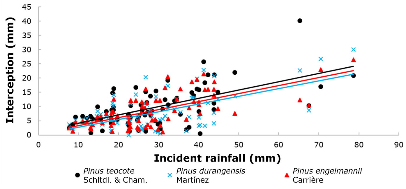The percentage of direct rainfall registered was 72.4, 71.9 and 70.4 % for P. durangensis, P. engelmannii and P. teocote, respectively, which, on average, amounted to 73.91 % of the total incident rainfall. Linear regression analysis showed that there is an acceptable relationship between direct rainfall and incident rainfall for each of the species studied. In all three taxa, the R2 values were above 0.70.