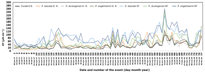 Table 3 summarizes the EC values. The incident rainfall amounted to 32.4 μS cm-1, showing an increase in relation to the values for direct rainfall in the three studied species. According to the analysis of the data on the electrical conductivity (μS cm-1) of the collected water, the behavior of stemflow was more varied than that of direct rainfall, with values above those of the incident rainfall, due mainly to the greater incorporation of particles and sediments during the movement of water through the stem and leaves. Based on these arguments, differences may be assumed between the chemical compositions of some of the components, which are associated with the presence of mineral salts and with particulate incorporation (Luna-Robles et al., 2019). Another factor that alters the behavior of the electrical conductivity is the quantity and entrainment of cortical anions, when the occurrence and quantity of rainfall events decrease, there is a greater accumulation of ions in the atmosphere, which will be entrained by the subsequent rains (Pérez-Suárez et al., 2006).