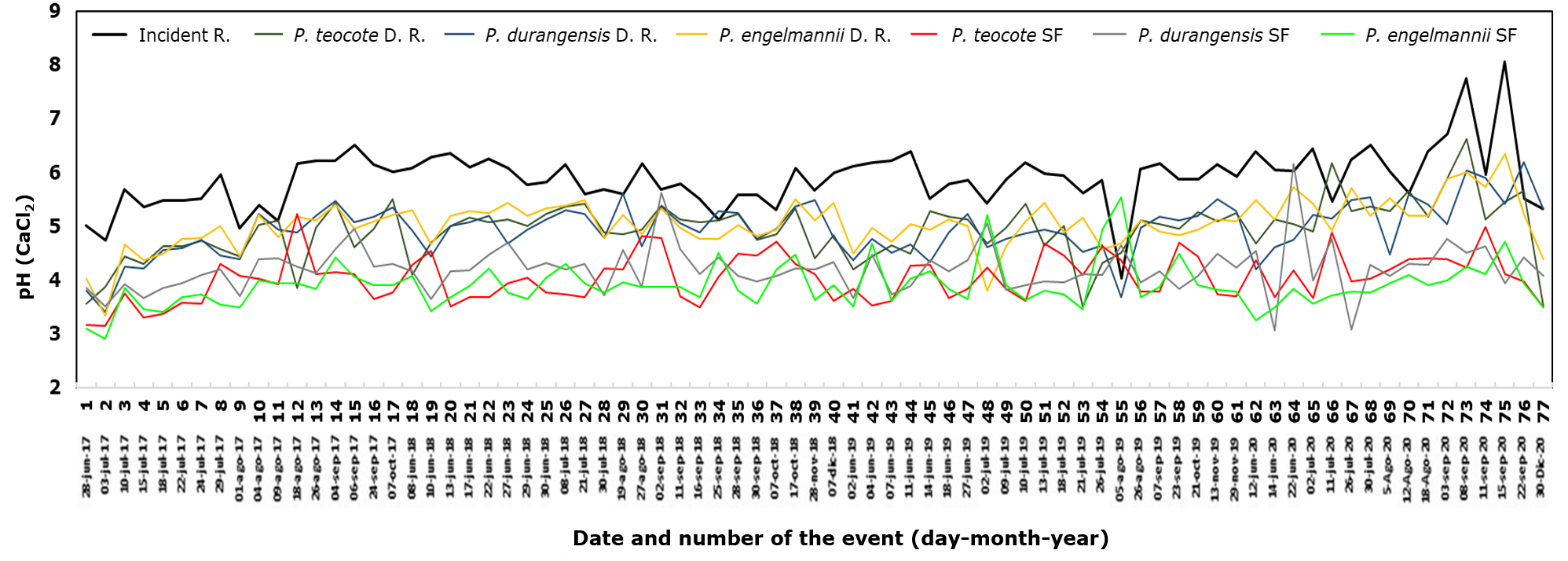 Table 3 shows that the average pH for incident rainfall was 5.9, for direct rainfall in the three species, it dropped to 5.0, while for the stemflow the value reached 4.1. Studies like the one by Béjar et al. (2018), who estimated the redistribution of precipitation and nutrient input in Pinus cooperi C. E. Blanco, documented results with the same trend; its pH records for incident rainfall ranged between 4.42 and 6.12; however, once the water flowed through the canopy, it decreased slightly to 4.21, and once the water came into contact with and flowed down the stem, it tended to acidify and reach figures of 3.85.