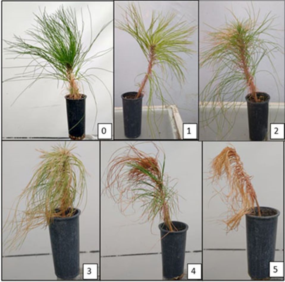 Clase 0 = Planta sana o asintomática; Clase 1 = Acículas caídas o con amarillamiento distal; Clase 2 = Marchitez parcial de la planta; Clase 3 = Marchitez media en la planta; Clase 4 = Marchitez avanzada en la planta; Clase 5 = Planta muerta.