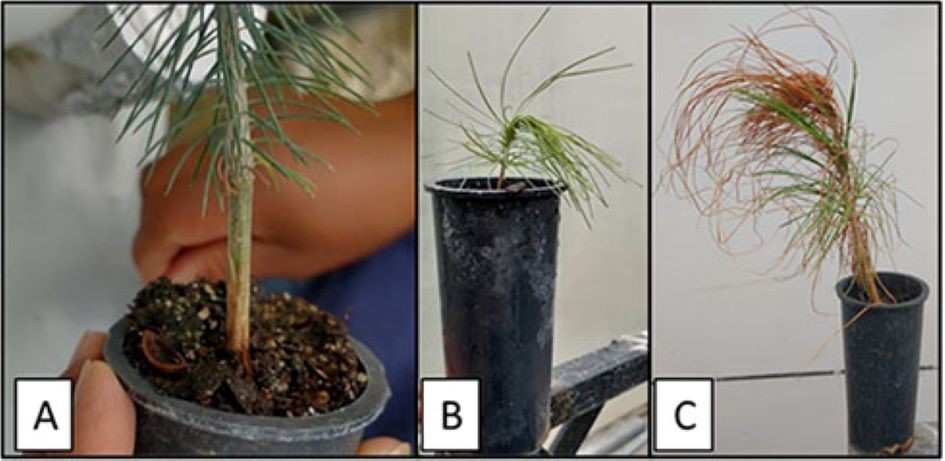 F. circinatum symptoms in plants began in week 12 after inoculation; chlorotic needles, reddish brown color and drying of foliage, apical bending, root rot and death were present (Figure 2). These symptoms coincide with those reported by Flores-Pacheco (2017) and García-Díaz et al. (2017).