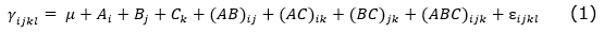 = Interaction of ith level of the A factor with jth level of the B factor with kth level of the C factor