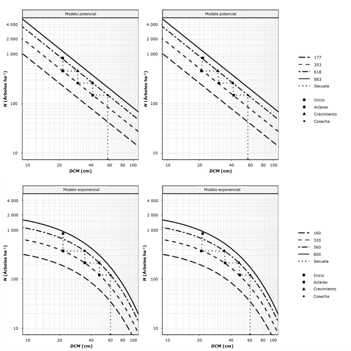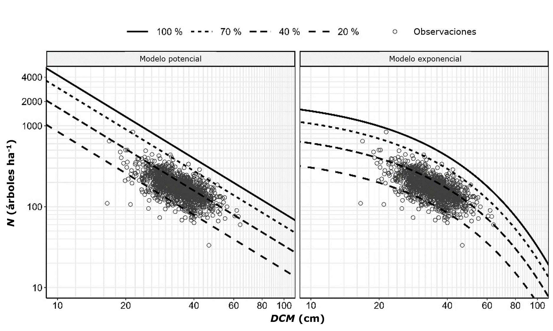 Otra expresión matemática fue propuesta por Quiñonez-Barraza y Ramírez-Maldonado (2019) para relacionar la densidad-tamaño. El modelo es de tipo exponencial y proyecta una curvilínea para delimitar la densidad máxima. A diferencia del modelo de Reineke, la función estima valores más reales en el intercepto, el cual está asociado con la densidad inicial que se presenta en las primeras etapas del desarrollo del rodal.