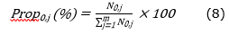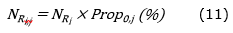2. El número de árboles residuales por especie (NRi,j) se obtiene respecto a su proporción inicial [Prop0,j (%)], como se muestra en la expresión (11).