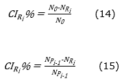 5. La intensidad de corta global (CIRi, %) es la diferencia de N0 y NRi después del aclareo i cuando i=1, entre N0, como se presenta en la expresión (14). El valor N0 se puede sustituir por NP-1 que indica el número de árboles proyectados previo al aclareo i cuando i>1, como se muestra en la Ecuación (15).