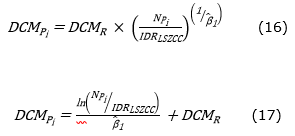 7. El crecimiento del DCM a nivel de rodal se obtiene al despejar DCM en (6) para el MP y (7) para el ME, pero expresado como proyección (DCMPi). Además, el valor del IDR se sustituye por el IDR relativo del límite superior de la ZC constante (IDRLSZCC). Por lo tanto, el DCMPi se obtienen con la Ecuación (16) para el MP y la (17) para el ME.