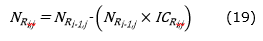 13. El NRi,j estará en función de la intensidad de corta (ICRi) que el silvicultor aplique a cada especie de acuerdo con su criterio y experiencia, siempre y cuando se practique una menor IC a la especie prioritaria, en comparación con el resto de los taxones. Para obtener NRi,j se utiliza la expresión (19).