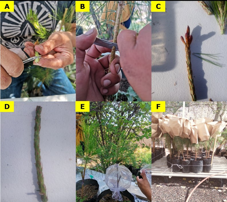Los injertos se realizaron el 30 de abril de 2023 en el vivero del Posgrado en Ciencias Forestales del Colegio de Postgraduados Campus Montecillo, Texcoco, México. Los patrones tenían una edad de 18 meses y su altura y diámetro al cuello de la raíz promedio era de 70 y 1.5 cm, respectivamente. Se siguió la técnica de enchapado lateral descrita por Pérez-Luna et al. (2019). La púa se preparó mediante dos cortes tangenciales paralelos de 5 y 1 cm de longitud cada uno (Figura 2A). En el patrón se realizó un corte tangencial de 4 cm de longitud con una ligera hendidura de 1 cm de profundidad (Figura 2B) para lograr un empate adecuado del injerto, el cual se fijó con hule cristal calibre 4 mm. Se emplearon dos tipos de varetas para injertar: púas con yema terminal (Figura 2C) y púas basales (sección de la base de la ramilla recolectada en campo, generalmente desechada en actividades de injertación) (Figura 2D). El injerto se cubrió con una bolsa de plástico transparente de 0.75 L, con desinfectante a base de sales de amonio cuaternario (10 mL L-1 de agua) aplicado por atomización para generar un microclima de alta humedad relativa (Figura 2E), el cual se cubrió con una bolsa de papel Kraft para proteger al injerto de la radiación solar y evitar la deshidratación (Figura 2F).